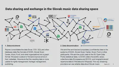 In the Open Music Europe project1, we are building a data infrastructure that aims to coordinate music knowledge (in our demonstration example, Slovak music) stored in various institutional silos and systems. We wanted to “plug in” the database of the MIC Slovak Music Centre (MCS) into a global data system like Wikipedia or Spotify and, at the same time, connect it with the Slovak CMO SOZA, the Slovak National Library and the music section of the ML Bratislava City Library. A data science company, Reprex, oversees this process.